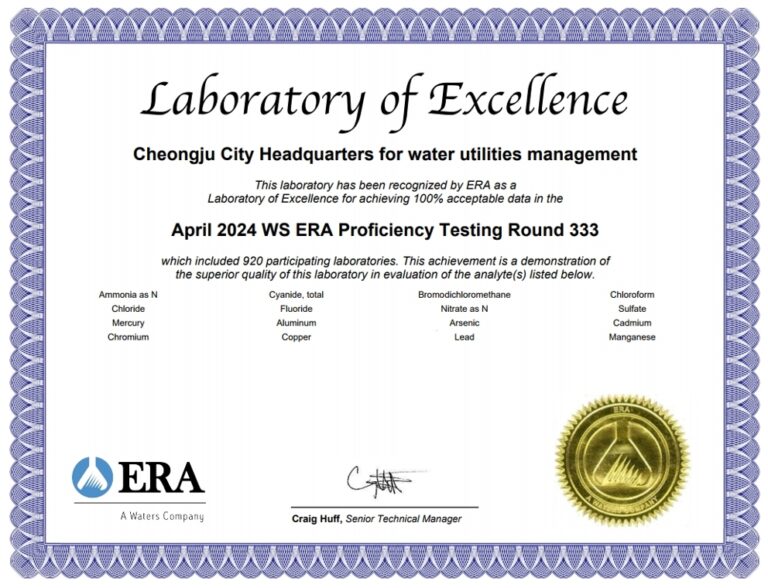 청주시는 먹는 물 분야의 국제숙련도 시험 평가에서 2018년을 시작으로 금년도까지 7년 연속 ‘적합’ 판정을 받으면서 국제적으로도 먹는 물 수질검사의 측정 및 분석 능력을 신뢰할 수 있는 기관임을 입증했다. 특히, 이번 시험에서는 알루미늄, 구리, 망간 항목에 대한 분석 능력을 추가적으로 인정받았다.