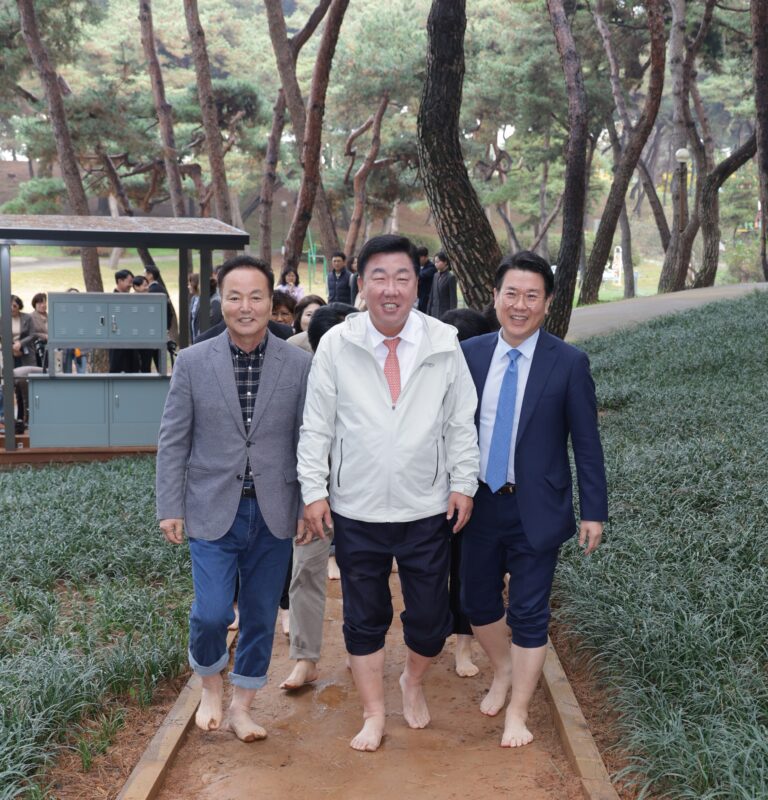 (사진 설명 : 청주시-SK하이닉스, 행복정원 맨발걷기길을 걷고 있다.(왼쪽부터 김현기 청주시의회 의장, 이범석 청주시장, 이일우 SK하이닉스 부사장). 청주시(c))