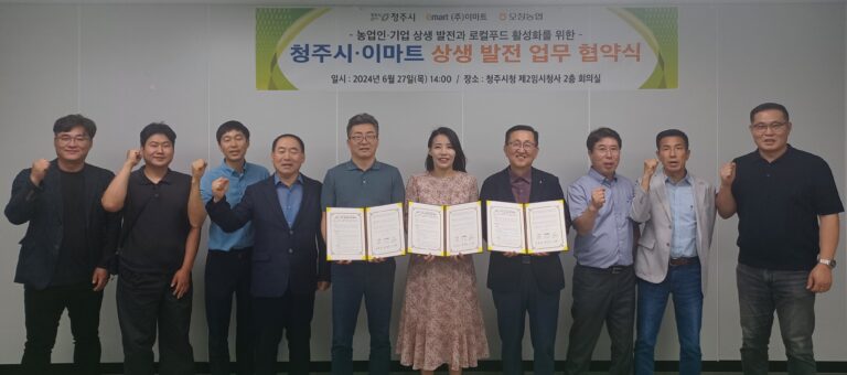 청주시는 27일 제2임시청사 회의실에서 (주)이마트, 오창농협과 상생 발전 업무협약을 체결했다. 협약식에는 김종관 청주시 농업정책국장, 권재일 ㈜이마트 청주점 점장, 이정희 오창농업협동조합 상무 등이 참석했다.