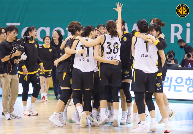 (사진 설명 : 개막전을 승리하고 기뻐하는 청주 KB스타즈. 사진 = KB스타즈 제공)