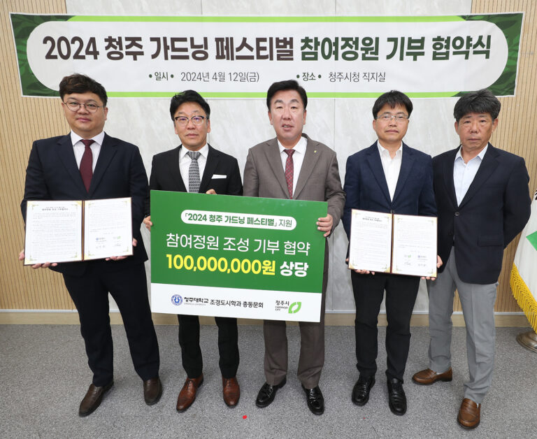 (사진 설명 : 청주 가드닝 페스티벌 참여정원 전시 후원 협약식 (왼쪽부터 청주대 조경도시학과 총동문회 임헌우 총무, 김민중 회장, 이범석 청주시장, 유서기 푸른도시사업본부장, 김인성 청주대 조경도시학과 50주년 추진위원장. 청주시(c))