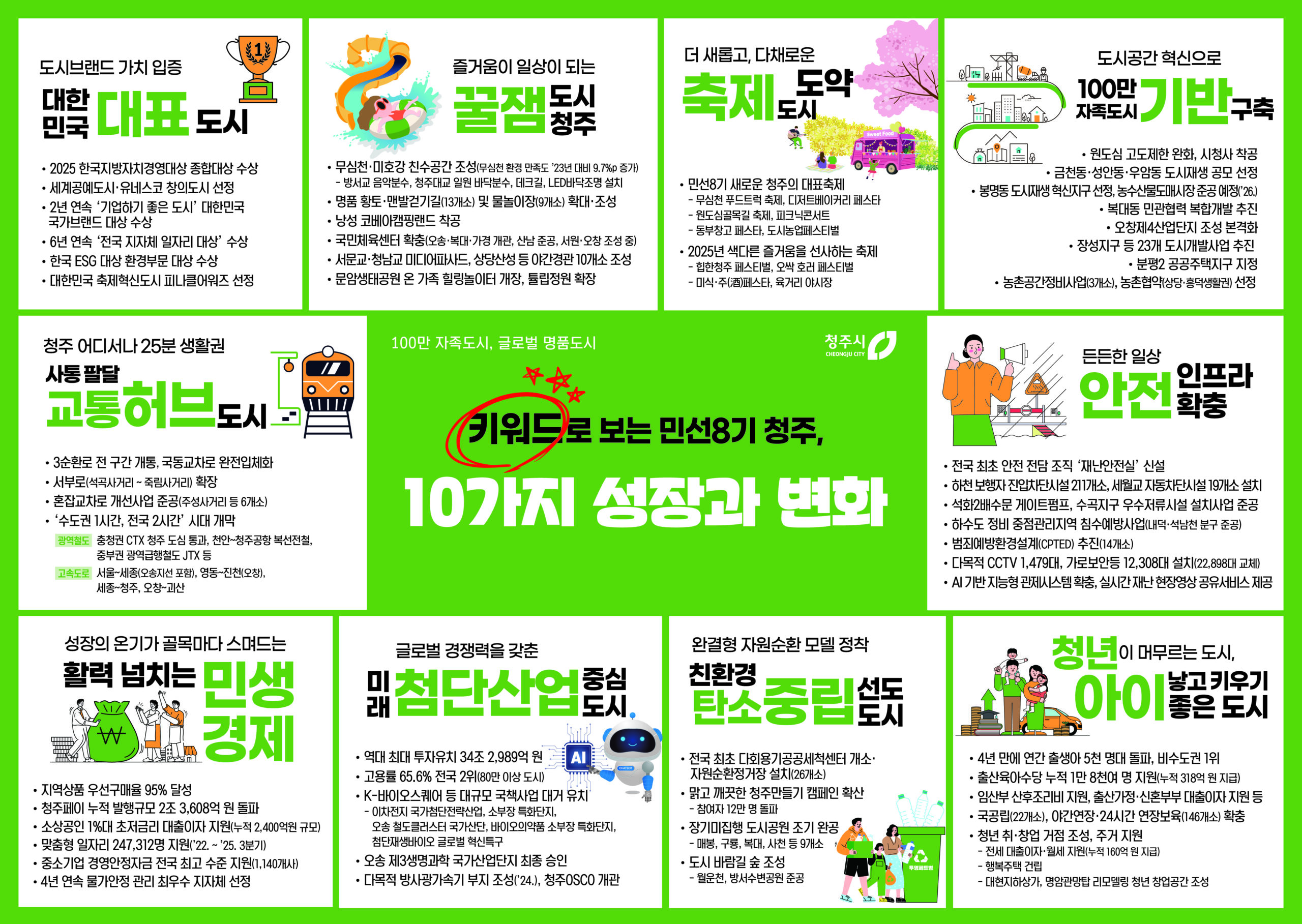 역대 최대 투자유치, 꿀잼도시, 교통허브 도시 등 10개 분야서 시민 행복 실현 청주시는 민선 8기 출범 이후 3년 6개월 동안 도시경쟁력 강화와 지역경제 활성화, 시민 삶의 질 향상 등 전...
