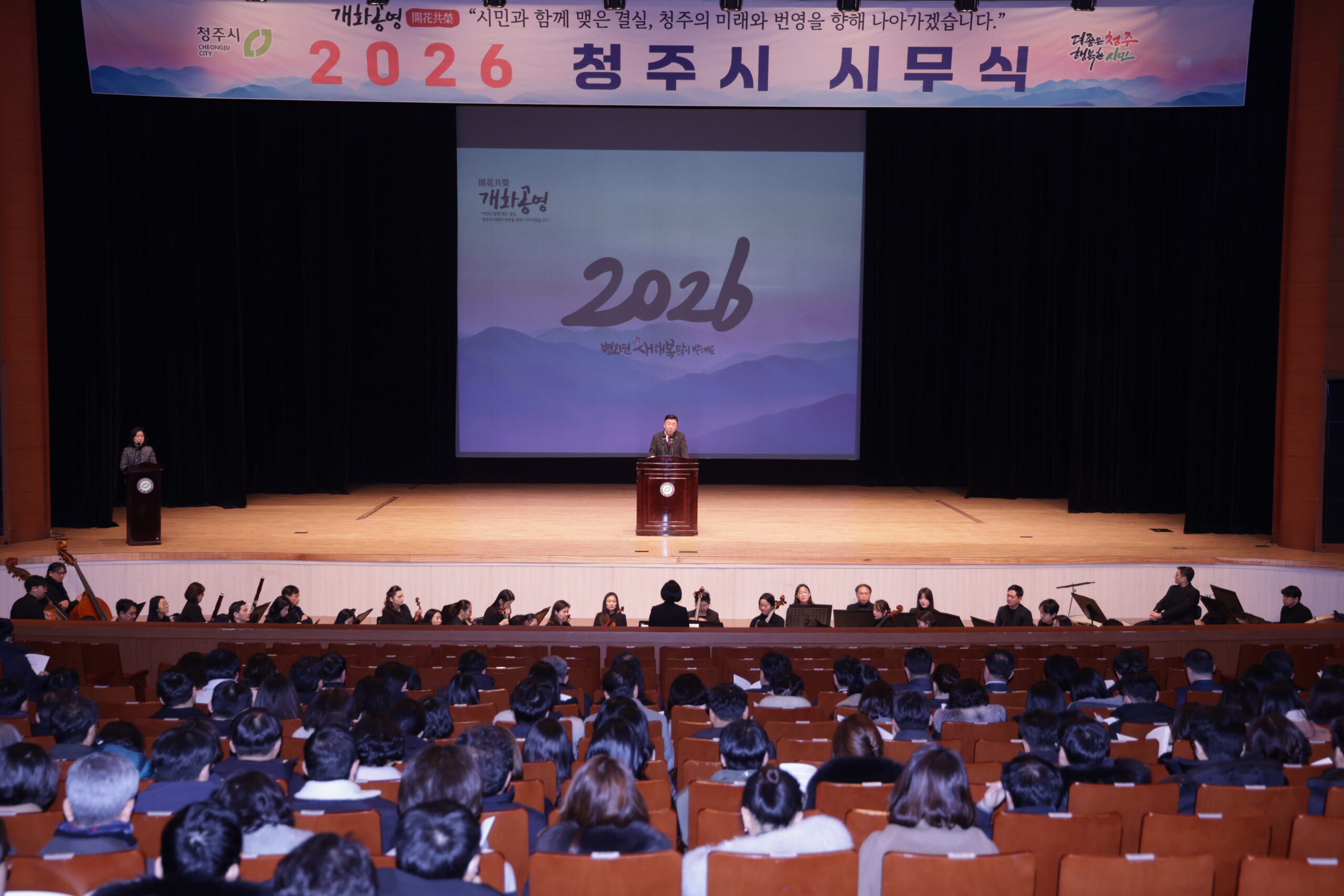 청주시는 2일 청주예술의전당 대공연장에서 2026년 시무식을 열고 새해 시정 운영의 힘찬 출발을 알렸다. 이날 시무식에는 이범석 청주시장을 비롯해 신병대 부시장, 시 직원과 산하기관 관계자 등 1천200여 명이 참석해 새해 각오를...